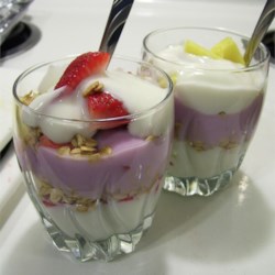 Delicious and easy, this is a fabulous mix of berries and yogurt! If you like, you can make a thin layer of graham crackers or granola in each vanilla/berry layer. That gives it a little more crunch.